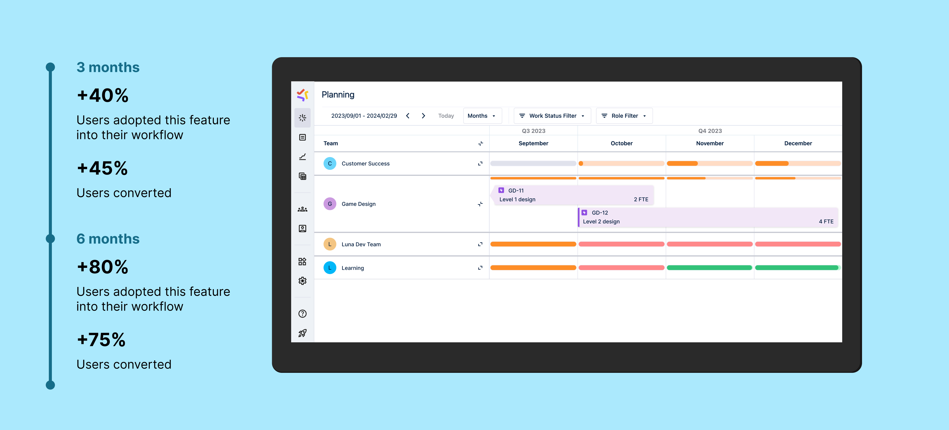 Talking to enterprise customers gave us this Aha moment of converting estimated hours from Jira epics to FTE so that Product/Project Managers could match that to the team’s capacity in FTE (which Planner already provides). This helped customers find even more value in the new Team Planning workflow by tying it to Capacity Planning and led to higher retention.