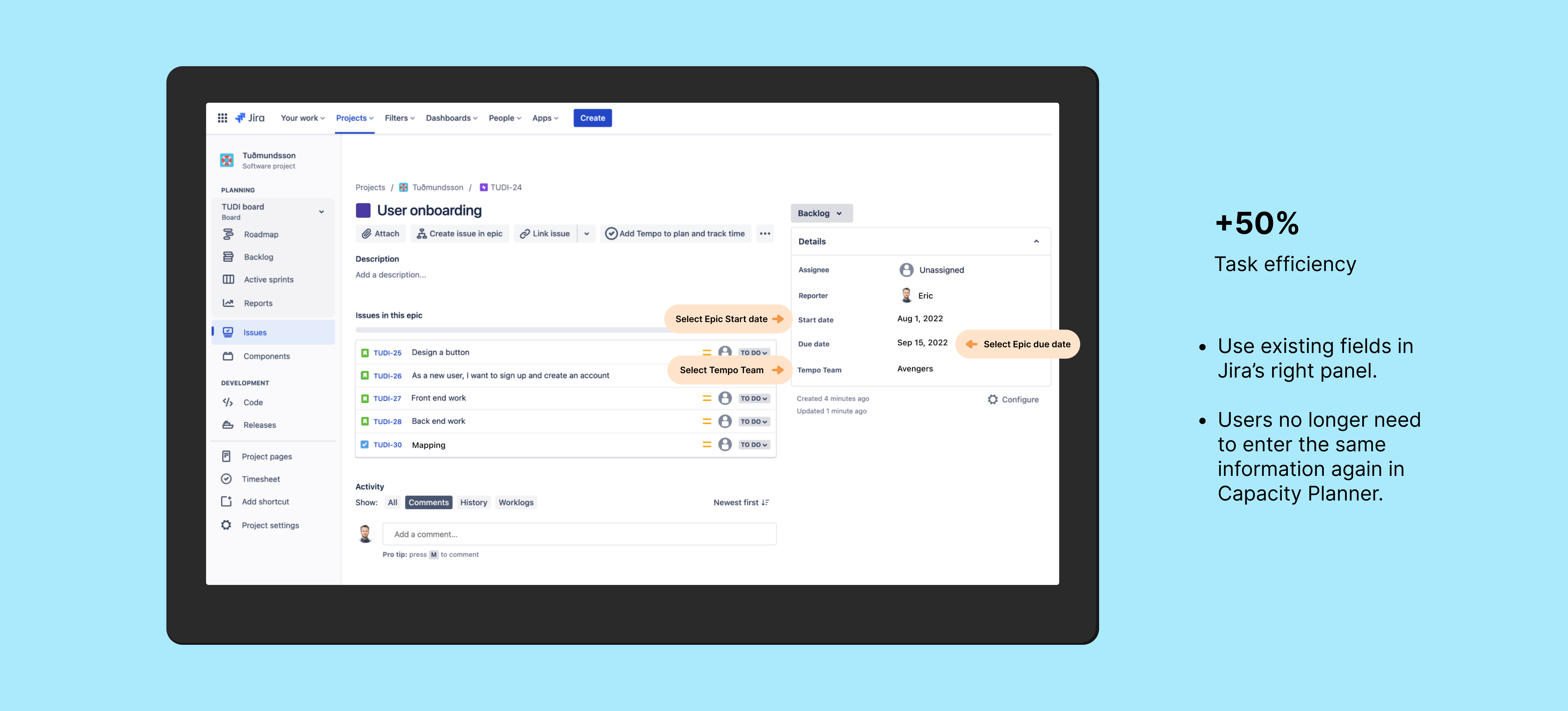 We identified what customers loved about the legacy feature and identified opportunities to go beyond. Existing in the Atlassian ecosystem gives us access to existing systems in place, like planning on Epics, using the Original Estimate field to calculate level of effort, etc. For the initial release we decided to utilize these processes to our advantage, which drove adoption, user conversion and task efficiency for the feature.